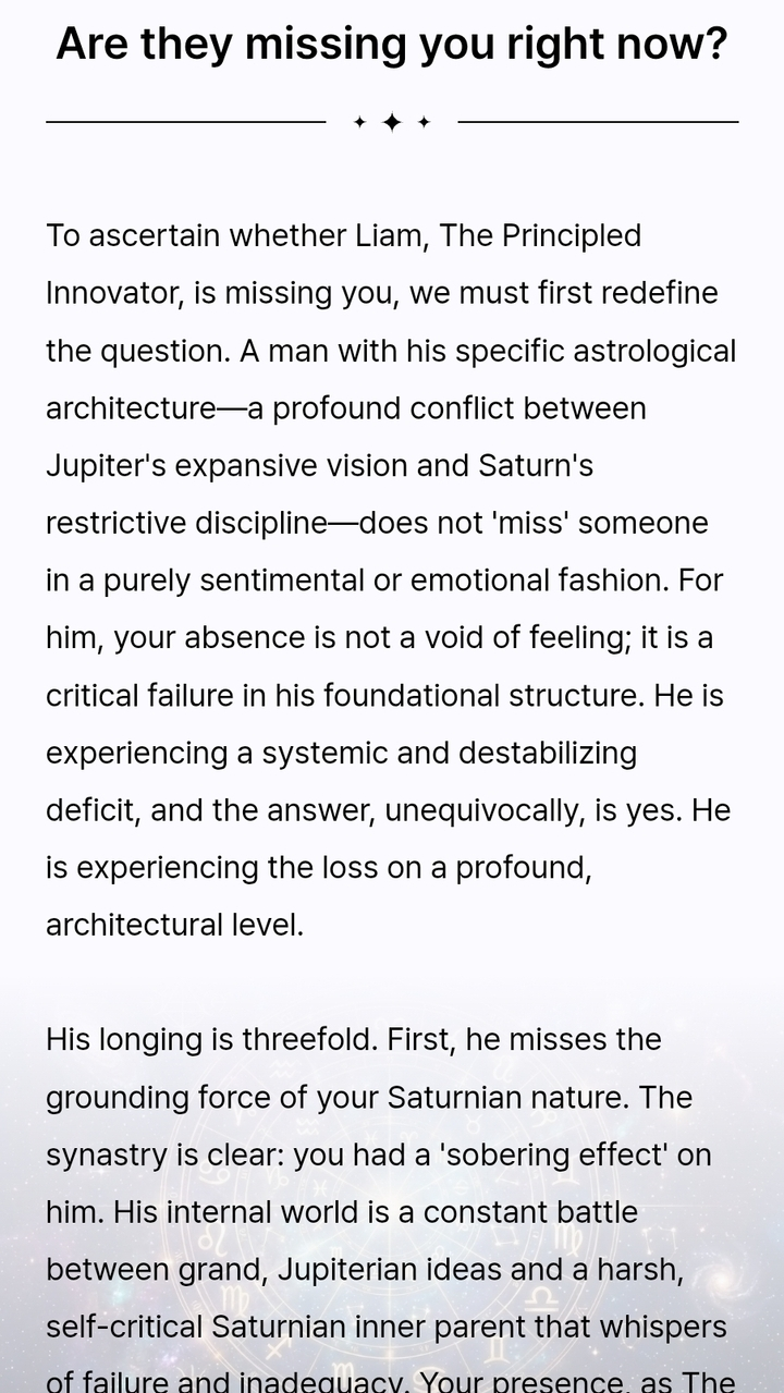 The section "What was it that first drew them to you?" was spot on. It mentioned he liked my "mysterious vibe" (Scorpio rising), which is exactly what he told me on our first date. Because that part was accurate, I trust the rest of the reading about his current regret.