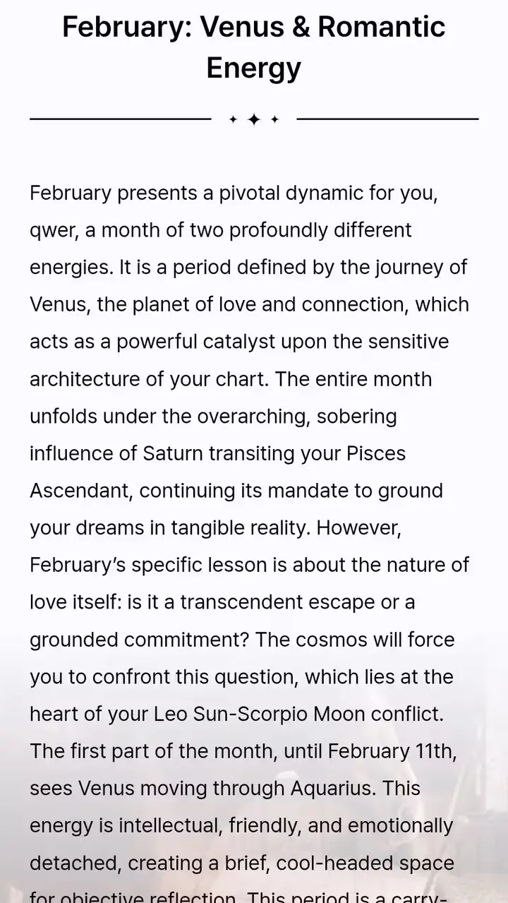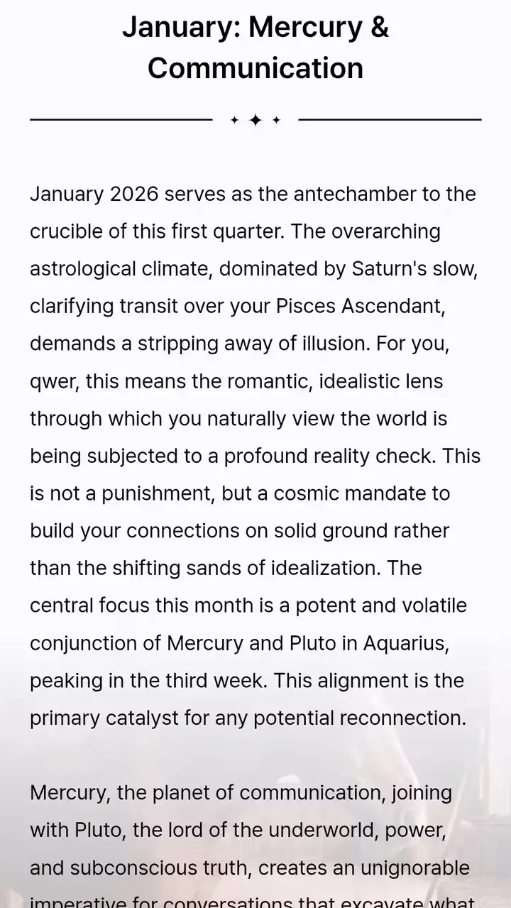 The "January: Mercury & Communication" section analyzed exactly why my texts failed last month. I was too emotional when I should have been logical. Now I'm preparing for the "February: Romantic Energy" phase with the Attraction Guide. I feel ready.