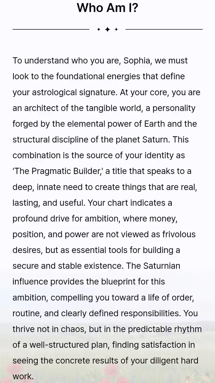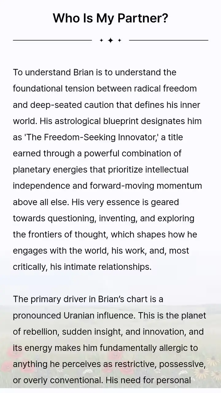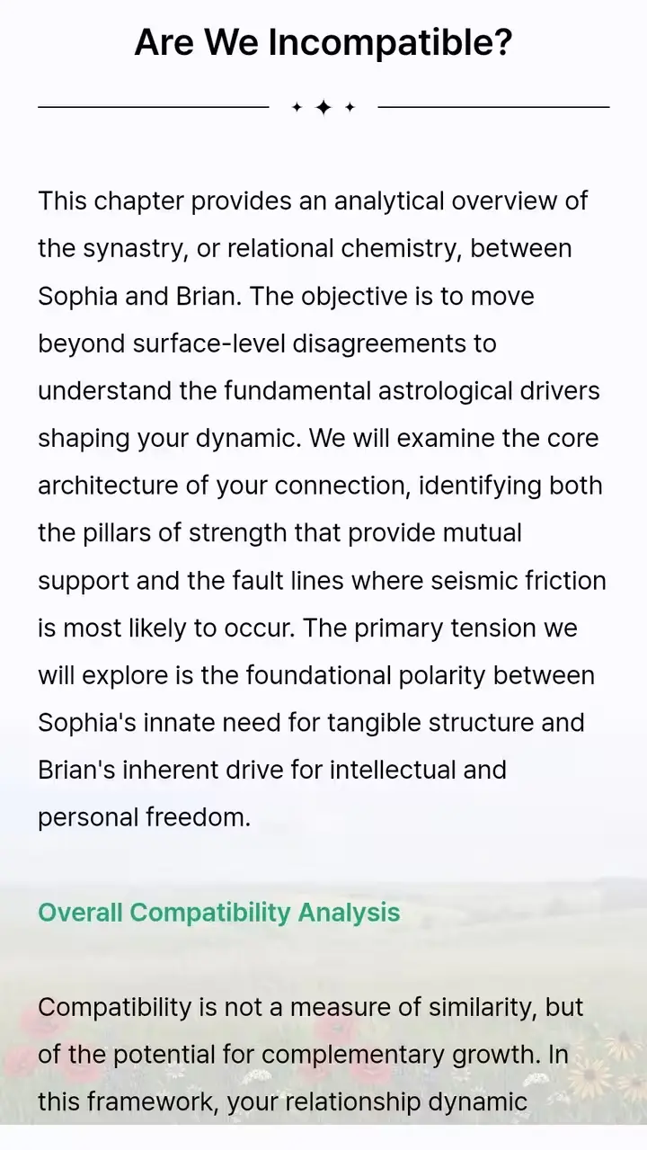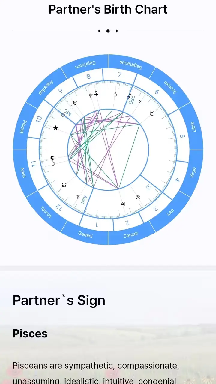 šĀ Personality Insight:Ā We analyze the Sun, Moon, and Rising signs to interpret each person's core nature and emotional needs. šĀ Compatibility Score:Ā We calculate your synergy by analyzing the geometric angles (Aspects) between your planets. šĀ Conflict Root Cause:Ā We focus onĀ Mercury (Communication)Ā andĀ Mars (Action/Aggression)Ā in your charts to pinpoint exactly why misunderstandings happen and how to fix them.